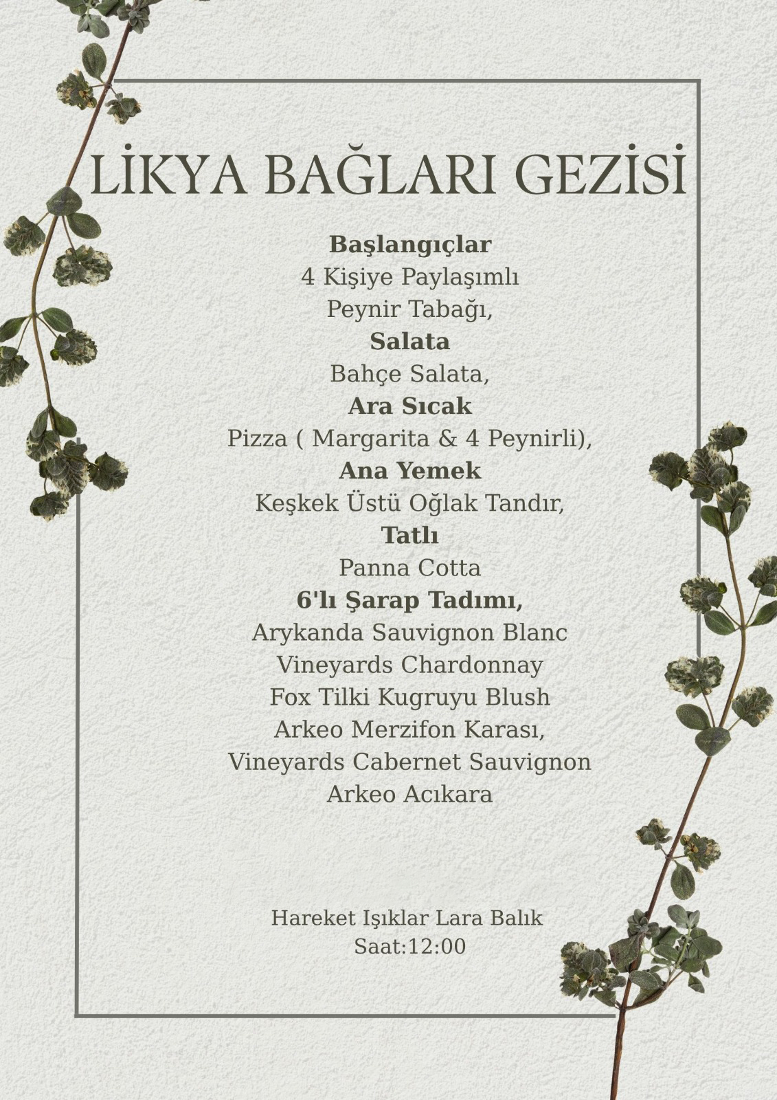 Sevgili Dostlarım, dönemimizin ilk gezisine Likya Bağları gezisi ile başlıyoruz. 27 Temmuzda hep beraber olacağımız, iyilik için birleşeceğimiz ve eğleneceğimiz bu gezide hem Likya bağlarını gezeceğiz hem de enfes yemekler tadacağız. Gezimizde dileyen dostlarımız kendi araçları ile gelebilir.Bununla birlikte hep beraber seyahat etmek amacı ile gezimiz için bir otobüs kiralanacaktır.