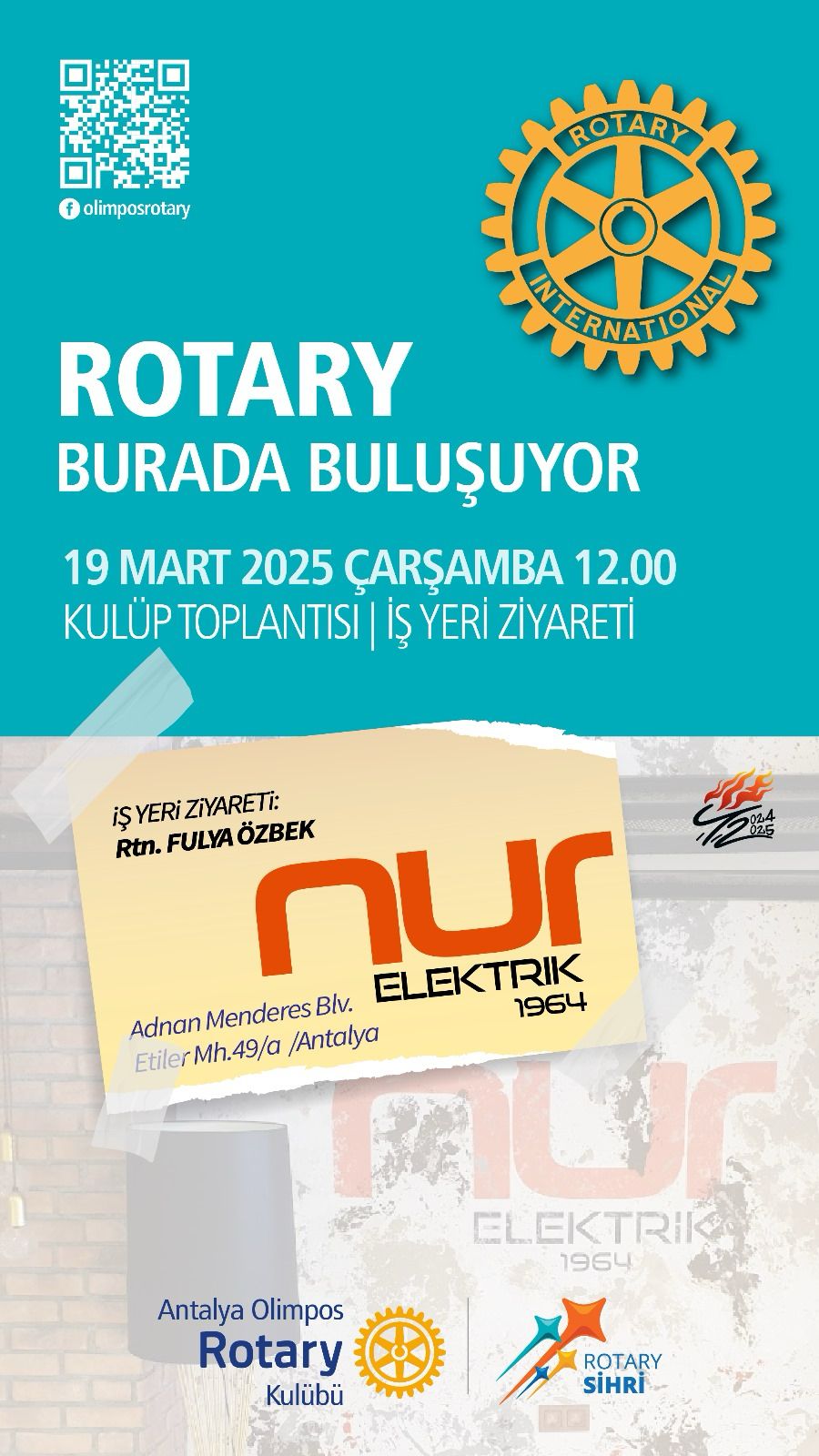 Sevgili Dostlarım; 19 Mart 2025, Çarşamba günü saat 12:00’de sevgili Rtn. Fulya Özbek'in işyeri Nur Elektrik'i ziyaret edeceğiz. Aydınlatma ürünlerinde günümüz modası, farklı ürün grupları ile ilgili bilgi alacağımız bu ilgi çekici ziyarete davetlisiniz. Lütfen katılım bildiriniz.RSS.