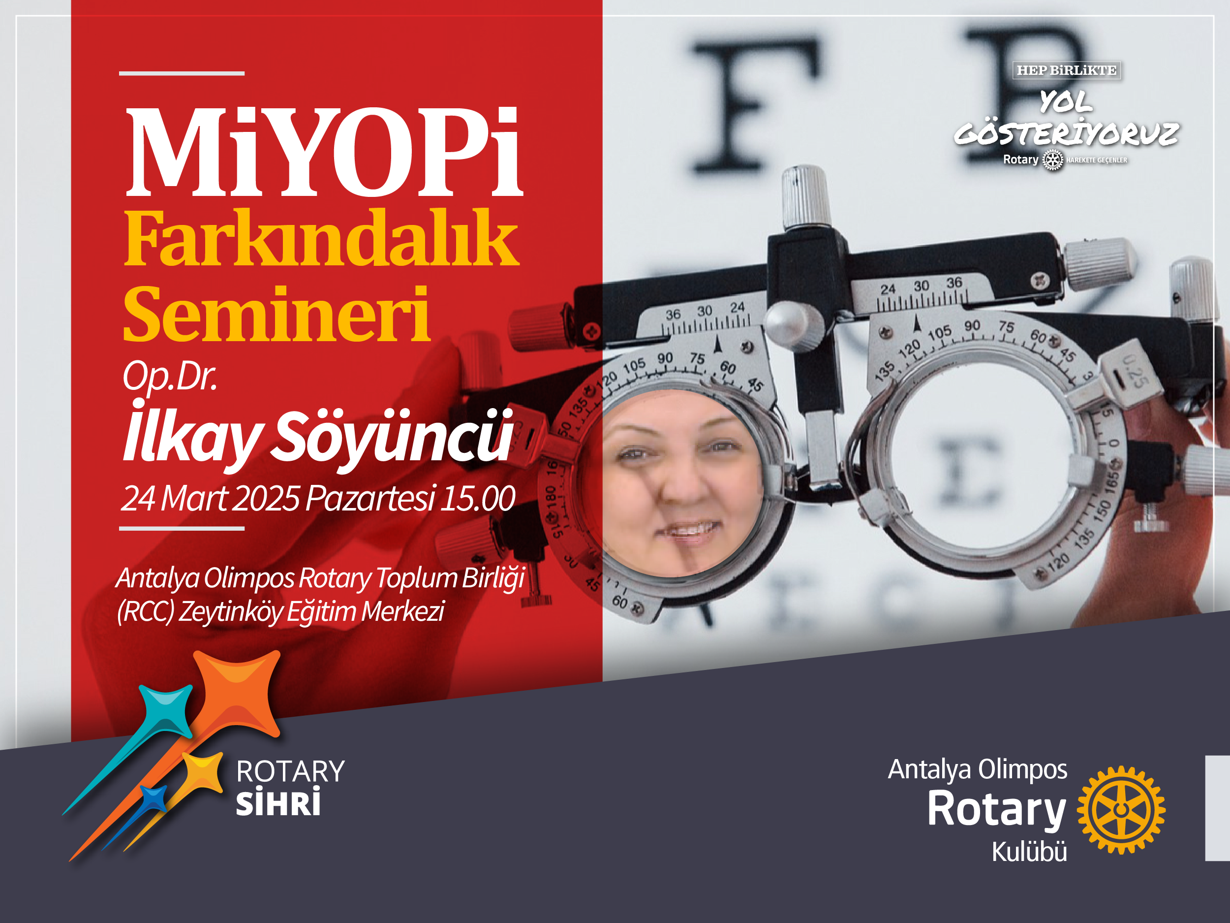 Sevgili dostlarim, 24 Mart 2025, Pazartesi günü saat 15:00’te Toplum Birliği (RCC) Zeytinköy Eğitim Merkezi ‘nde dönem başkanımız Rtn. İlkay Söyüncü tarafından “Miyopi” farkındalık semineri verilecektir. Desteğiniz kıymetlidir, lütfen katılım bildiriniz. RSS