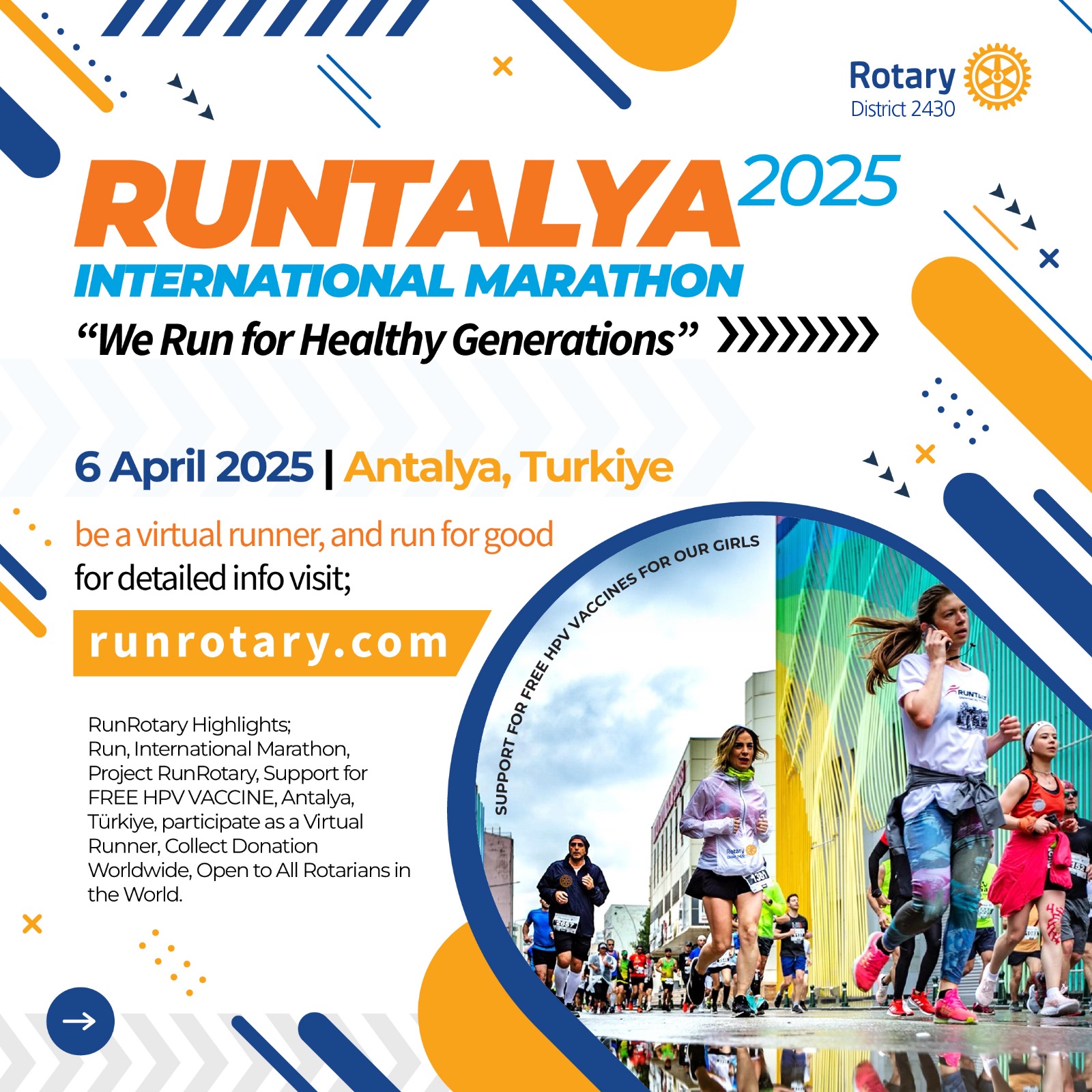 Antalya'nın ve Rotary' nin eşsiz buluşmalarından olan Runrotary 6 Nisan'da yapılacak. Gelenekselleşmiş Makarna partisi ve koşu programıyla Rotary ailemiz bir araya gelecek. Olimpos Rotary Ailesi olarak, bu etkinlikte sanal ya da fiziki en az 2 koşucuyla yerimizi almak istiyoruz. Start noktasında olmak isteyen dostlarımızı bekliyoruz.