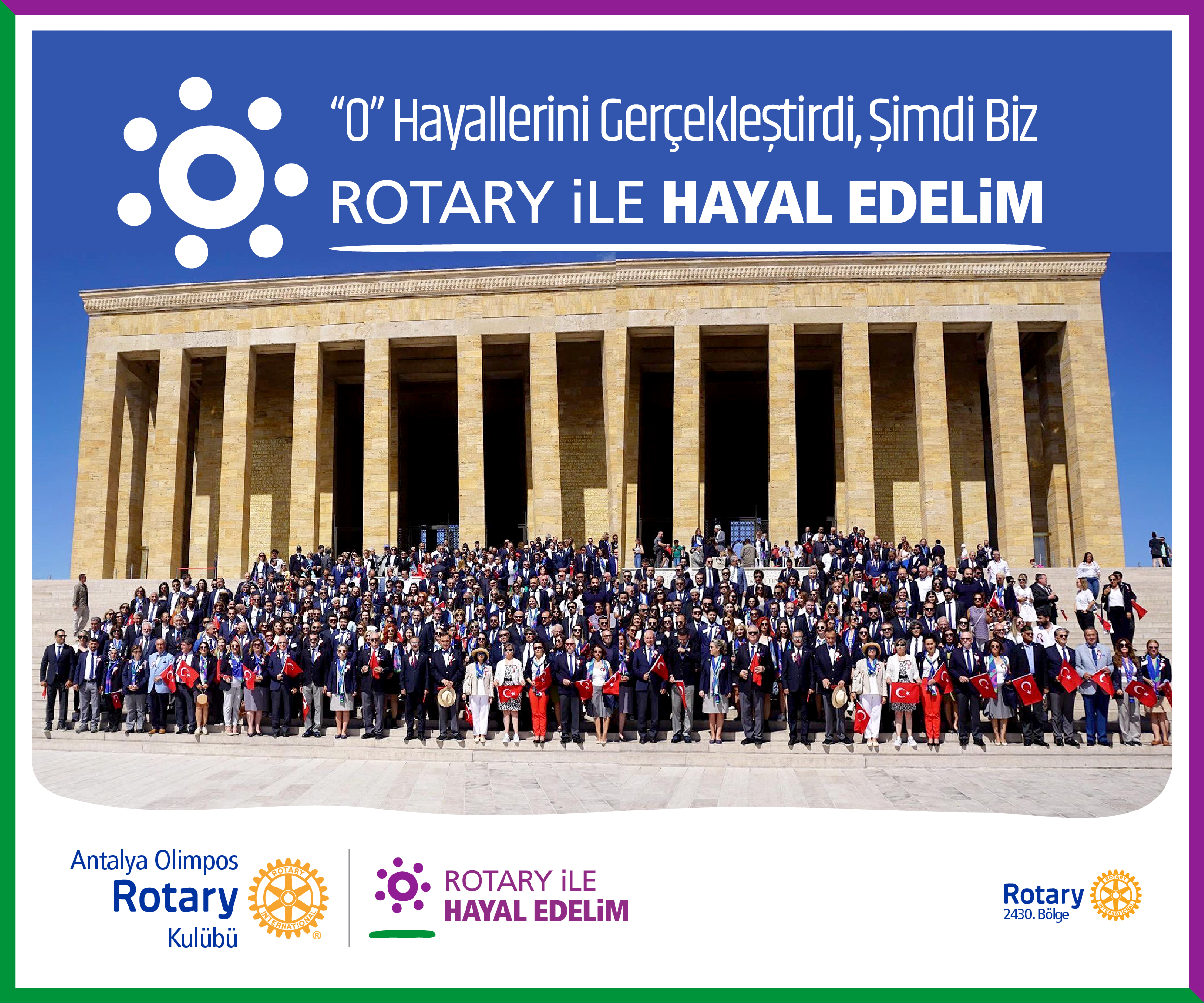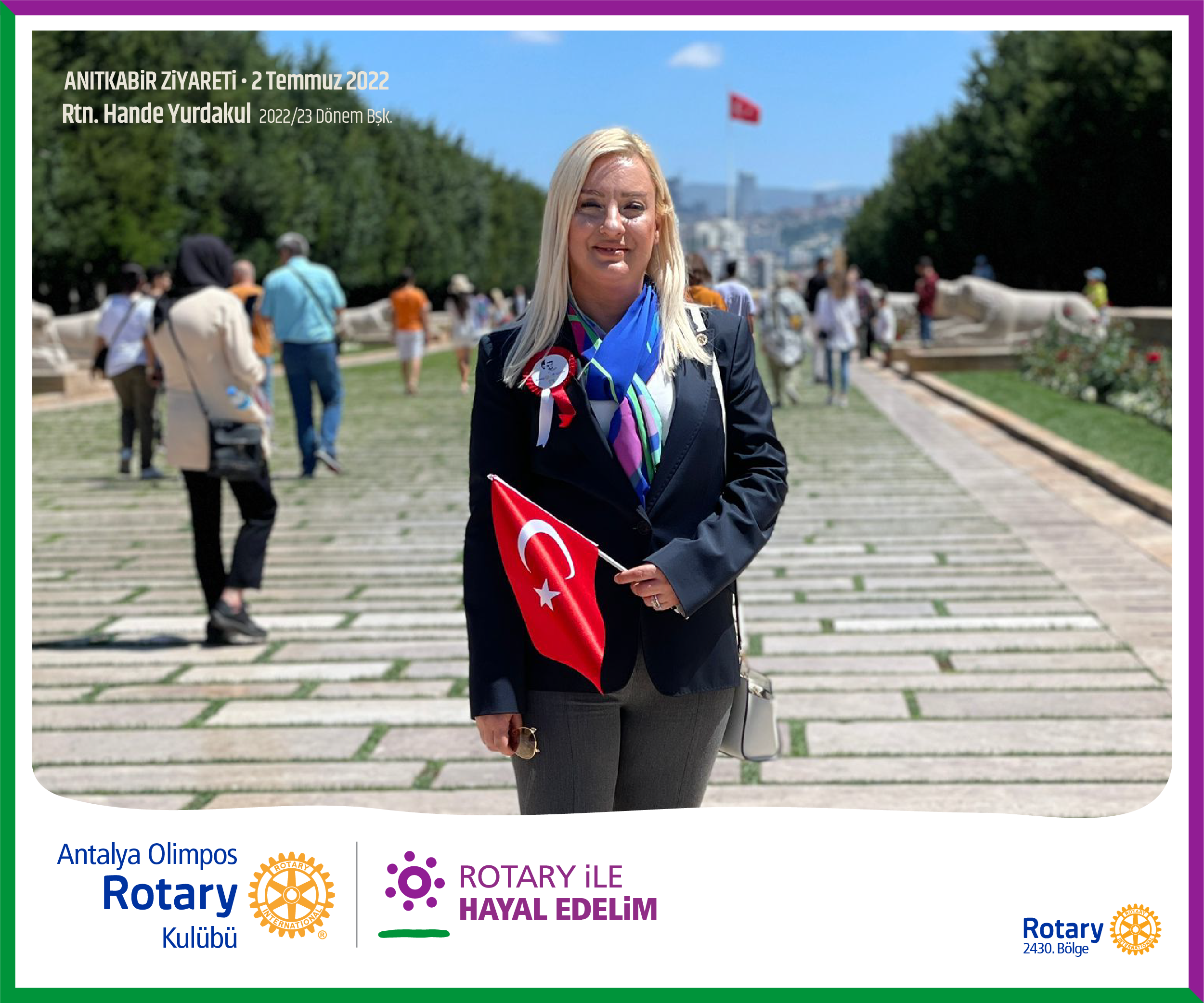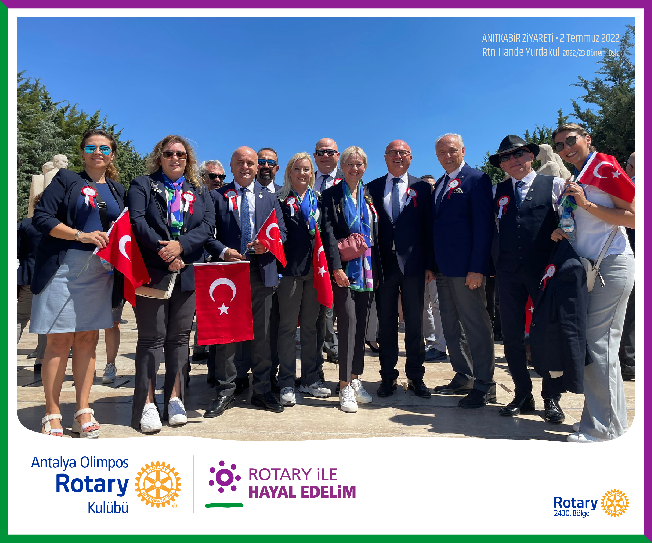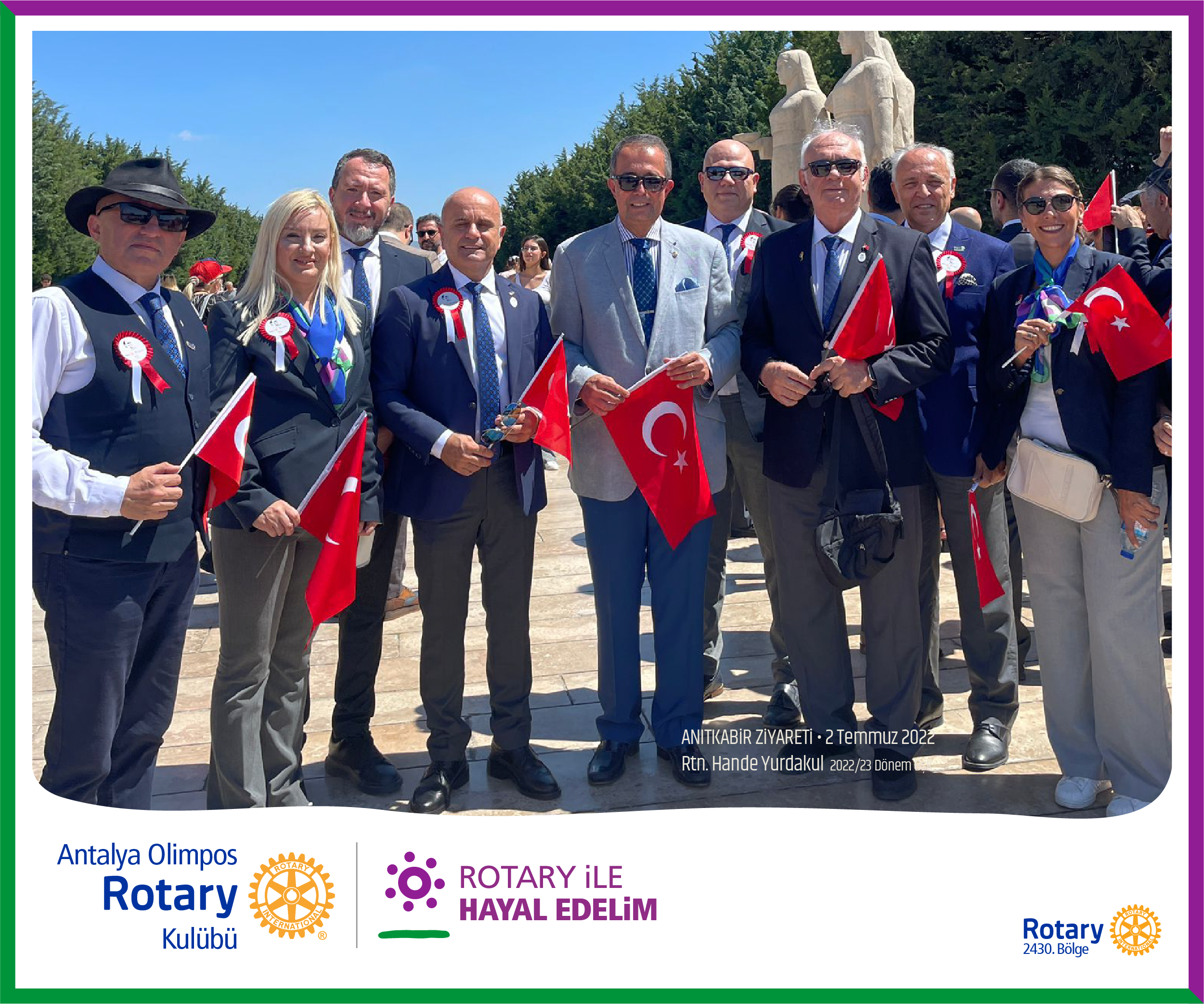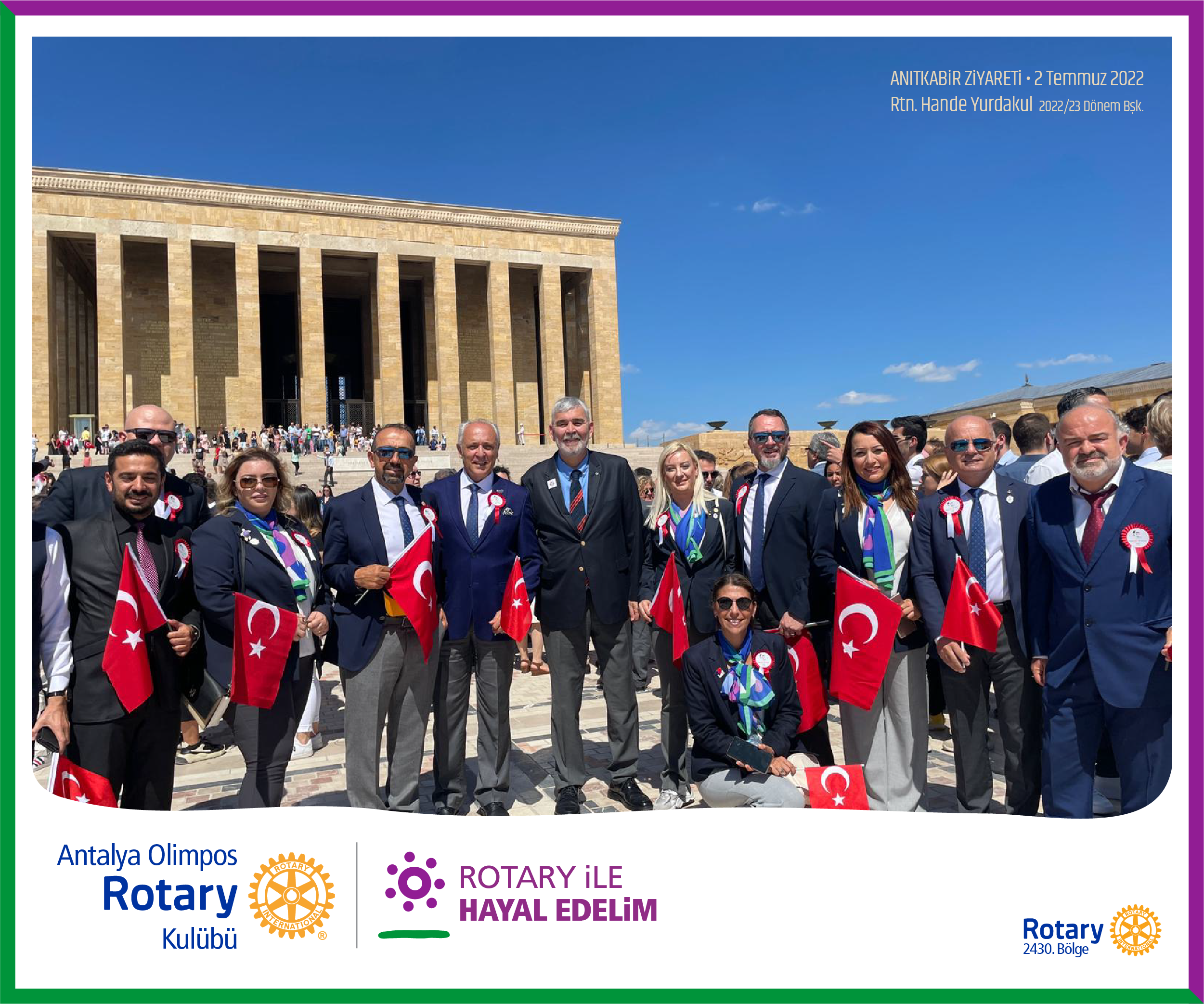 Rotary 2022/23 döneminde "Rotary ile Hayal Edeceğiz" bu sürece çağdaş Türkiye'nin kurucusu Mustafa Kemal Atatürk’ü Anıtkabir'de ziyaret edip, aziz ruhuna saygılarımızı sunarak başladık. O'nun yarattığı bir ülkede bizler de Rotaryenler olarak projelerimizle, iyilik hizmetlerimizle çalışacağız, emek harcayacağız. Benden önce bu yurt toprakları diye düşünen Ulu Önderimize "Kendinden Önce Hizmet" diyerek layık olmak istiyoruz. Tüm hayallerimiz bu ülke için, güçlü çağdaş aydın ve özgür bir Türkiye için...