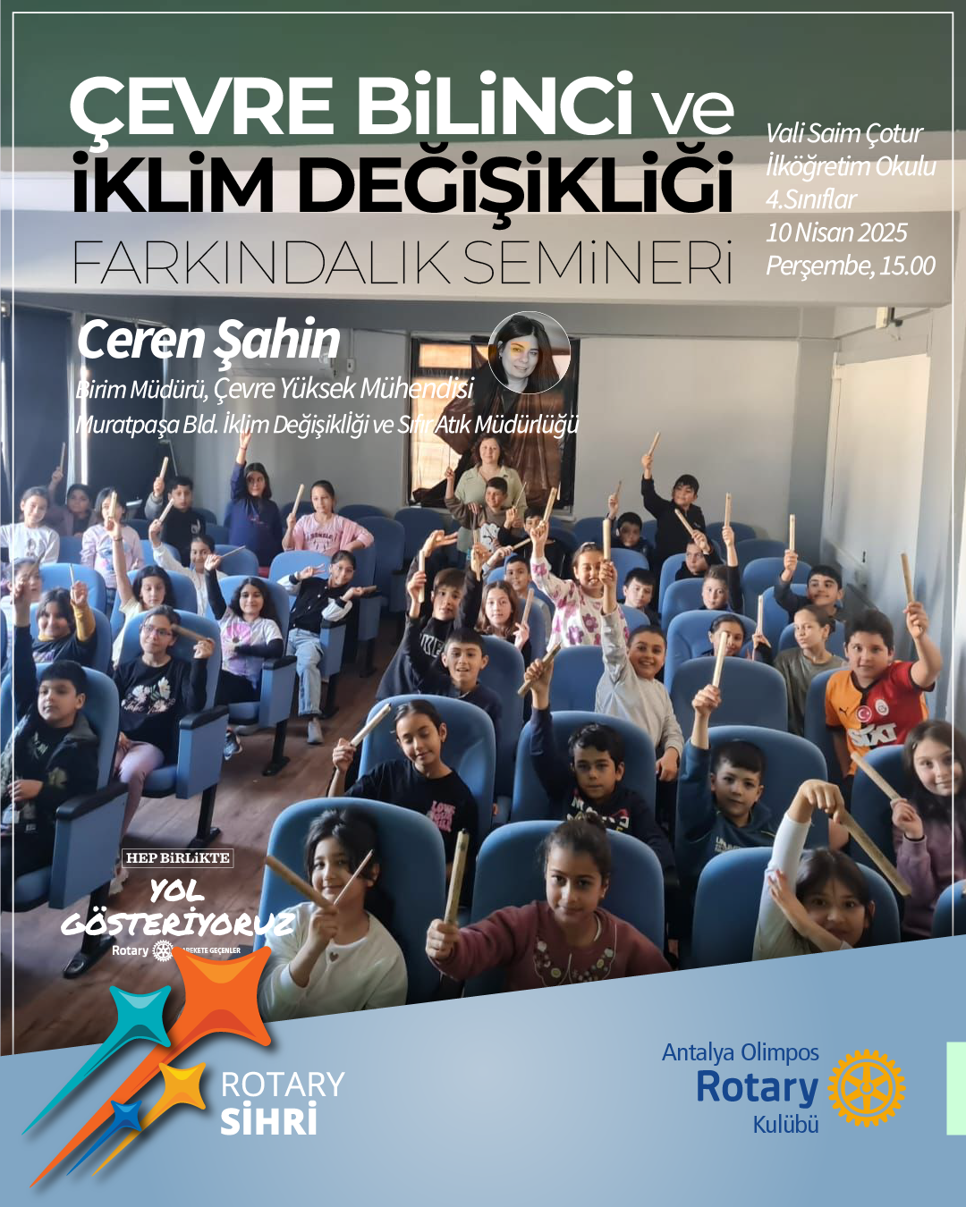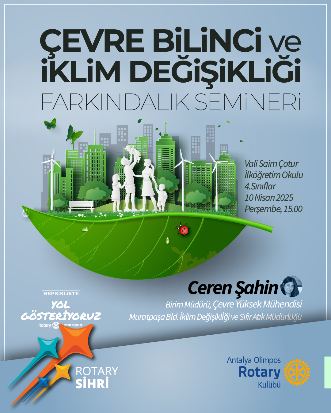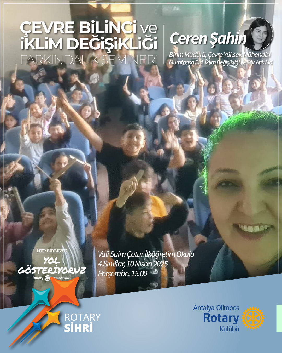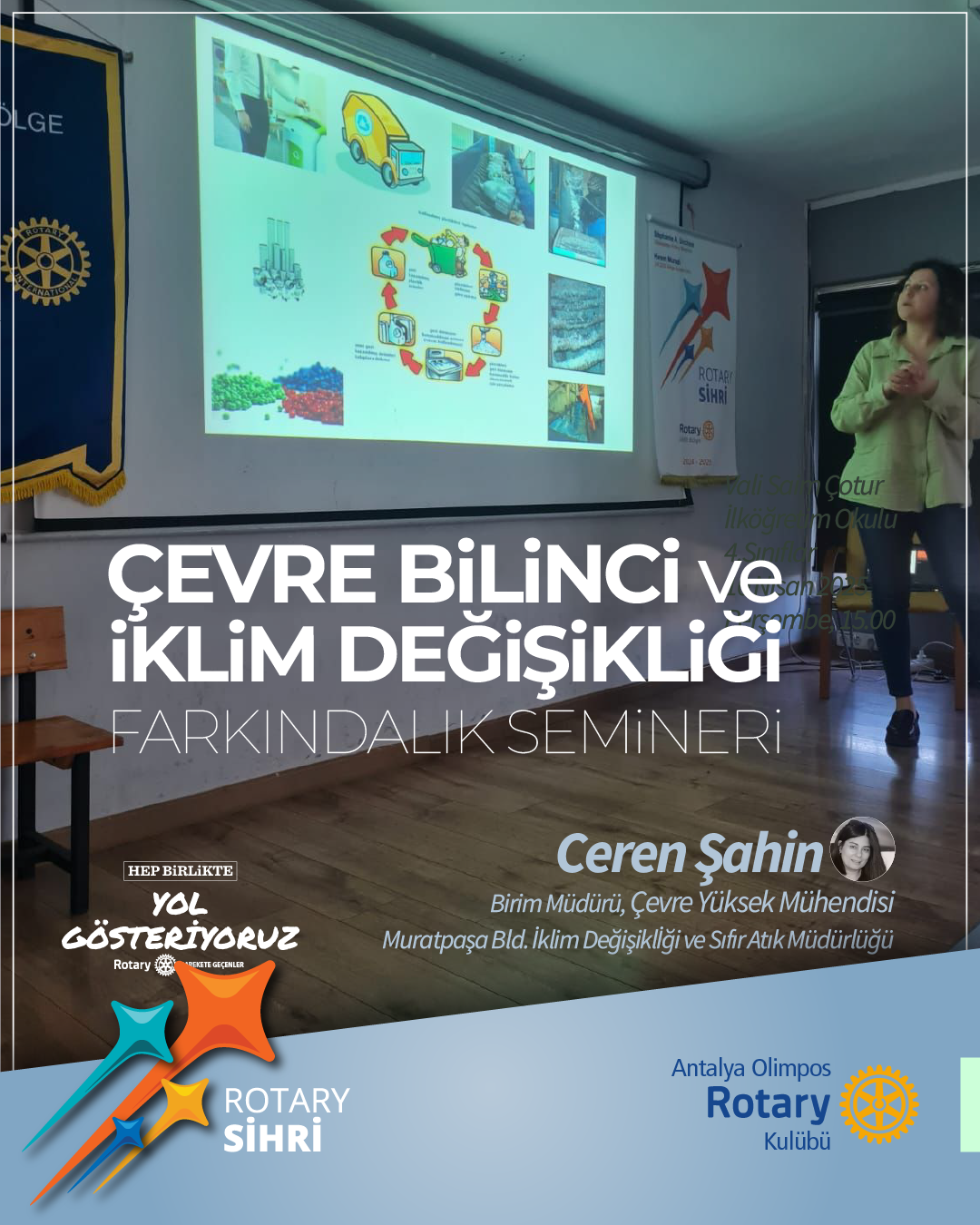 Bireylerin ve toplumların doğaya ve çevreye zarar vermeden, sürdürülebilir bir yaşam anlayışıyla hareket etmeleri anlamına gelen "Çevre Bilinci ve iklim Değişikliği" konulu seminerimiz10 Nisan Perşembe 15:00 de, Muratpaşa Belediyesi Çevre Yüksek Mühendisi, İklim Değişikliği ve Sıfır Atık Müdürlüğü birim müdürü Ceren Şahin sunumu ile Vali Saim Çotur İlköğretim Okulu'nda üyelerimizin ve kalabalık bir öğrenci topluluğu ile gerçekleştirildi. İlginiz ve desteğiniz için teşekkür ederiz.