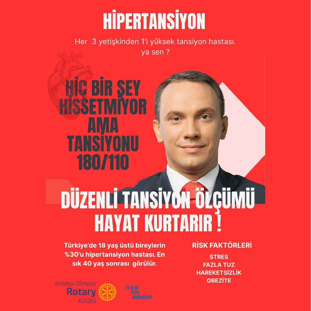 Antalya Olimpos Rotary Kulübü, 31 Temmuz 2025, Perşembe günü Tam Nokta Neo’da hipertansiyon farkındalığı oluşturmak amacıyla önemli bir etkinlik gerçekleştirdi. Hipertansiyon konusunda farkındalık yaratmak amacı ile İyilikte birleşen tüm dostlarımıza gönülden teşekkür ederiz. RSS Antalya Olimpos Rotary Kulübü 2025/26 Dönem Başkanı Rtn. Tuba Subaşı