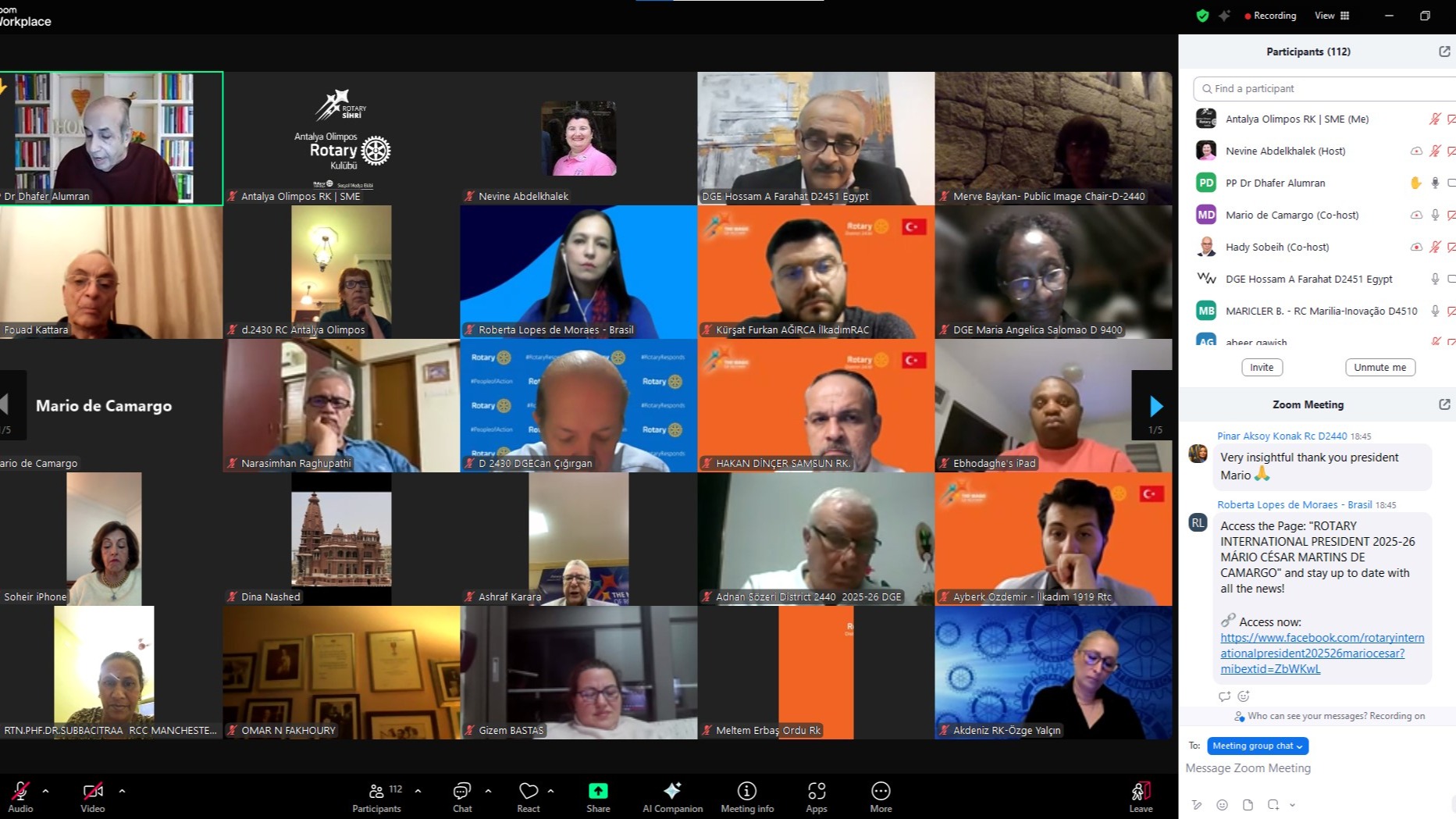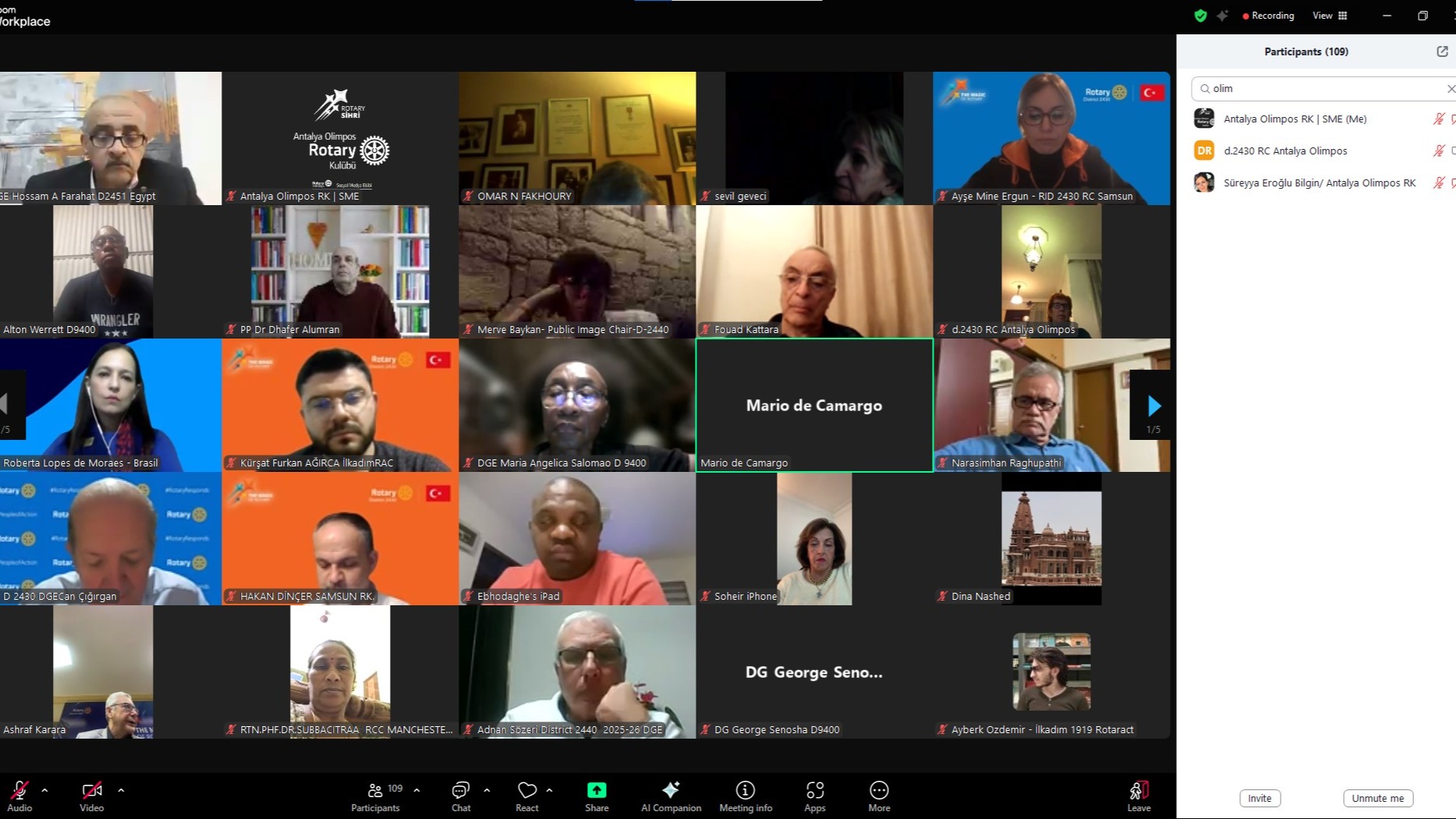 Rotary Club of ElTahrir & District 9400 & Rotary Club of Samsun in Turkey & Rotary Clubs in Districts 2451 and 2452 and 2430 were met in a scheduled Zoom meeting "Rotary International President Elect Mario Cesar Martins de Camargo conversation on How to grow and innovate through Rotary" Antalya Olimpos Rotary Kulübü