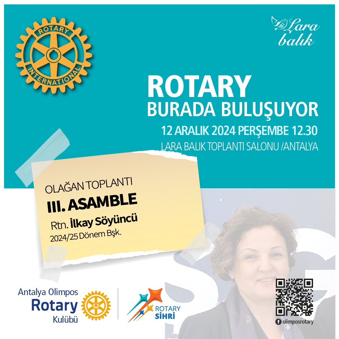 Antalya Olimpos Rotary KulübüOlağan Kulüp Toplantısı, III.Asamble12.12.2024, 12.30Lara Balık Toplantı Salonu, Lara /Antalya@antalyaolimposrotary #olimposrotary #antalyaolimposrotary #antalya #themagicofrotary #rotarysihri #sihirlidönem #rotary2430bölge #rotarydistrict2430 #rotaryturkiye #rotary2430 #rotaryinternational #diversity #equity #inclusion #hareketegeçenler #peopleofaction @rotaryinternational @rotarydistrict2430