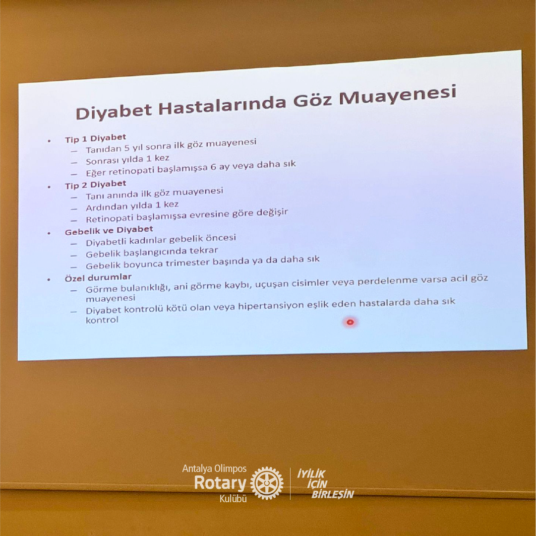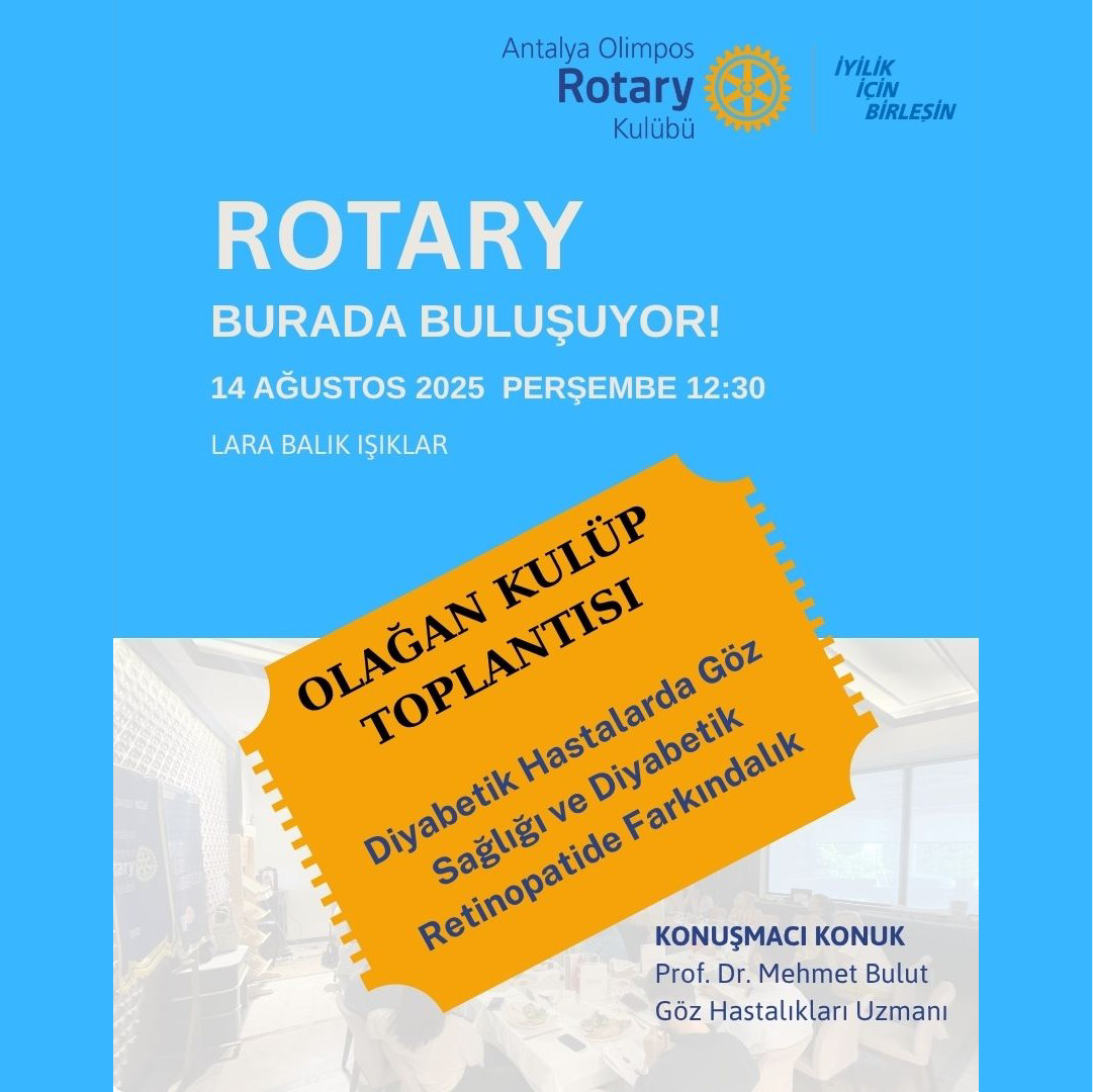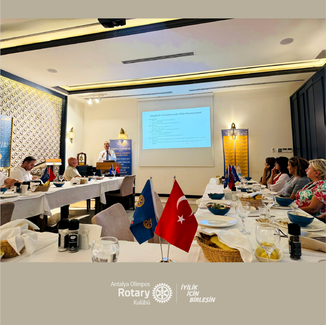 Sevgili Dostlarımız, 14 Ağustos 2025 tarihinde yapılan olağan toplantımızda Göz Hastalıkları Uzmanı Prof. Dr. Mehmet Bulut tarafından "Diyabetik Hastalarda Göz Sağlığı ve Diyabetik Retinopati" hakkında bir sunum gerçekleştirilmiştir. Mehmet Bulut'a bilgi ve deneyimlerini bizimle paylaştığı için teşekkür ediyoruz.