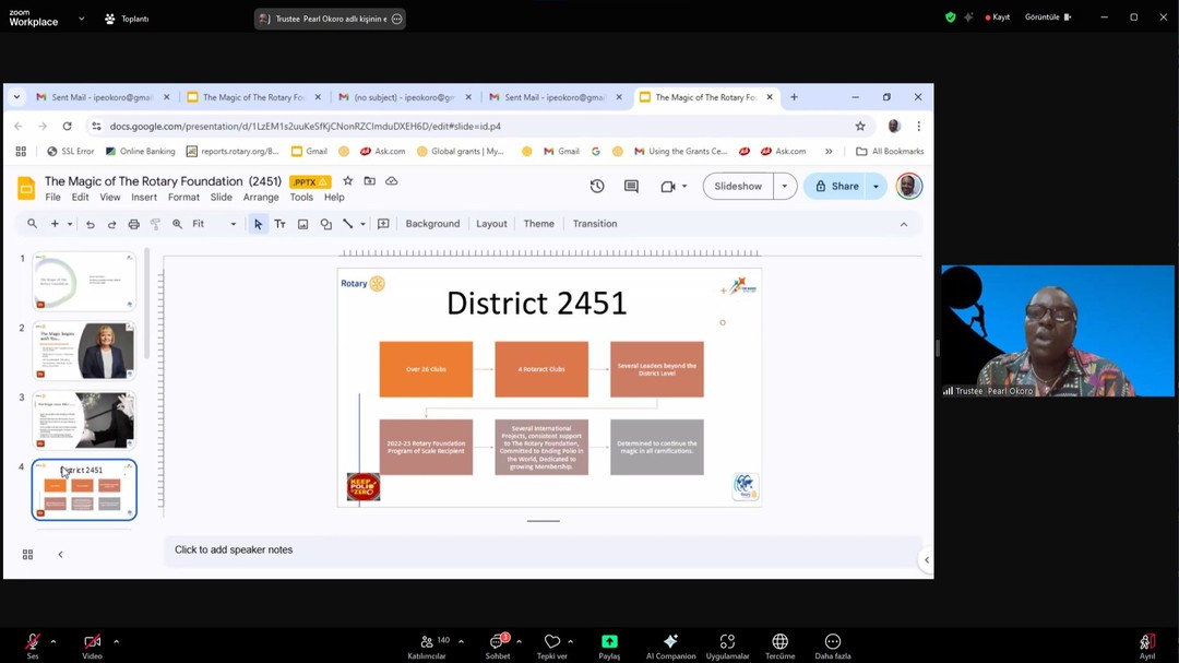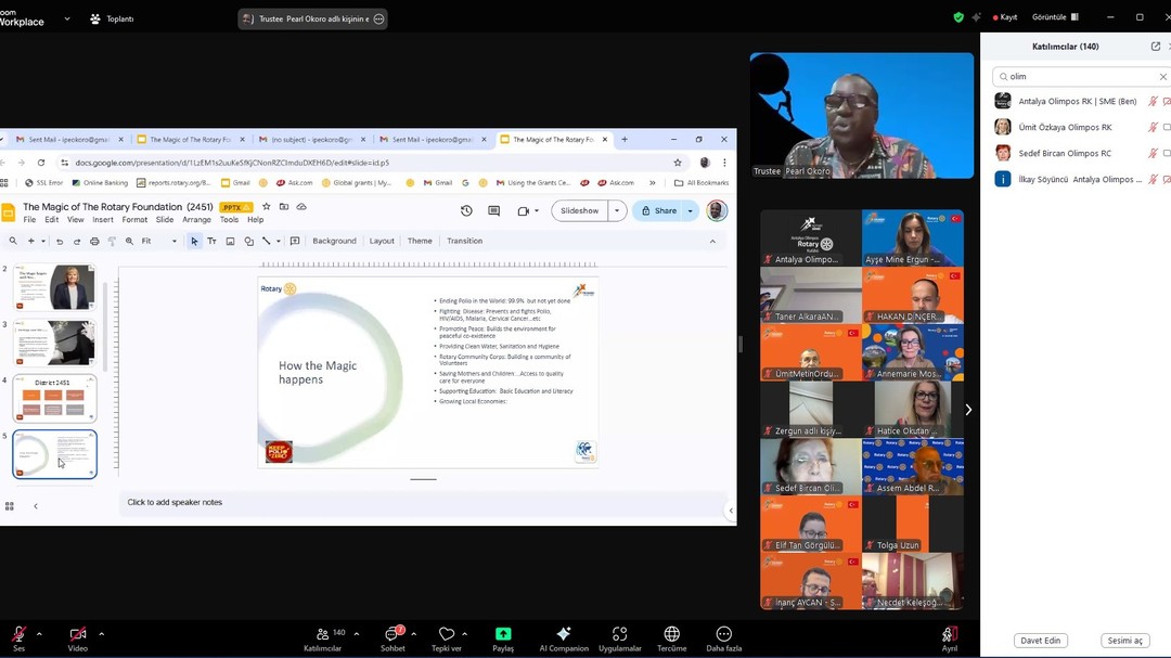 Samsun Rotary Kulübü ve Rotary Club of El Tahrir'in ortaklaşa düzenledikleri ve TRF TRustee Ljeoma Prarl Okoro (Nijerya) nun "Rotary Vakfının Sihri" sunumunu yaptığı çevrimiçi uluslararası toplantıya katıldık. Vakıf konusunda bilgilendirici ama daha fazlası ile bir rotaryen tutkusunu hissettiğimiz bu toplantıda emeği geçen, katılan tüm paydaşlara teşekkür ediyoruz. Rtn İlkay Söyüncü 2024/25 Dönem Bşk.