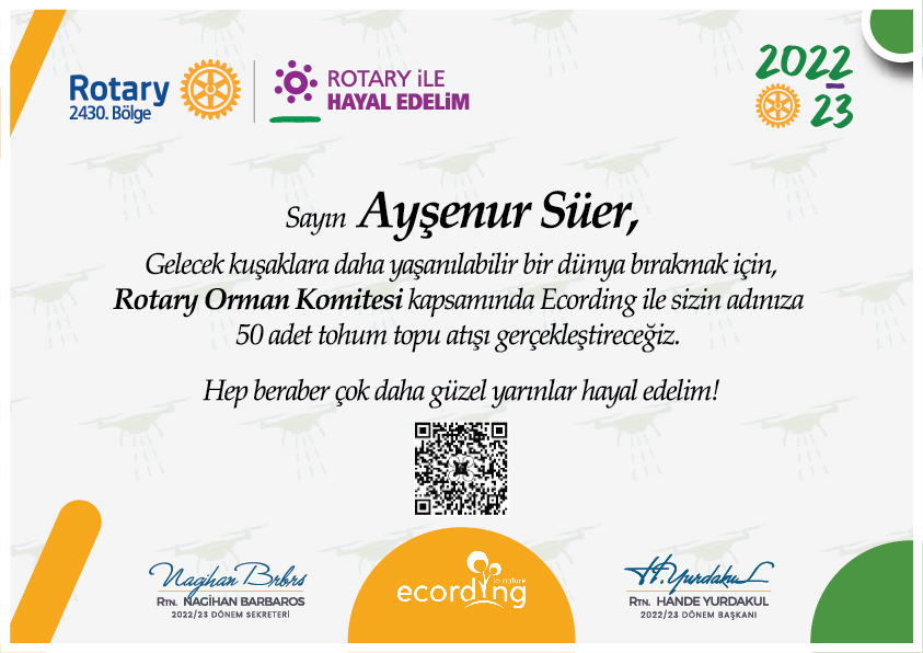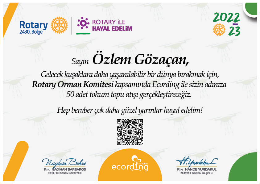 “ROTARY ORMANI” Rotary Ormanı Projesi kapsamında 34 üyemiz için 1700 tohum topu satın alımı gerçekleştirilmiş ve kişiler adına sertifikalar düzenlenmiştir. 1 Aralık 2022 tarihi itibarı ile kulüp olarak proje yükümlüğümüzü yerine getirmiş bulunmaktayız.
