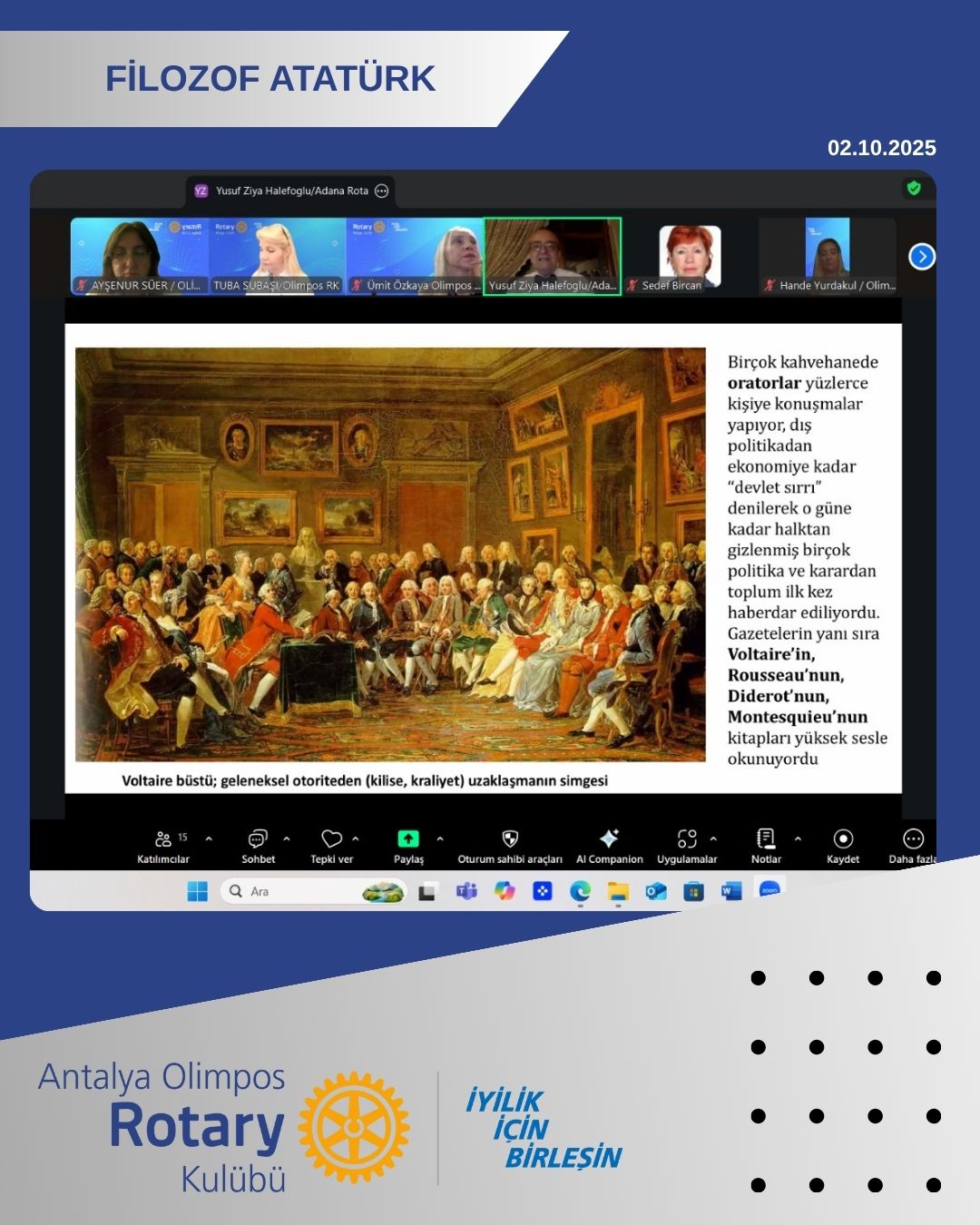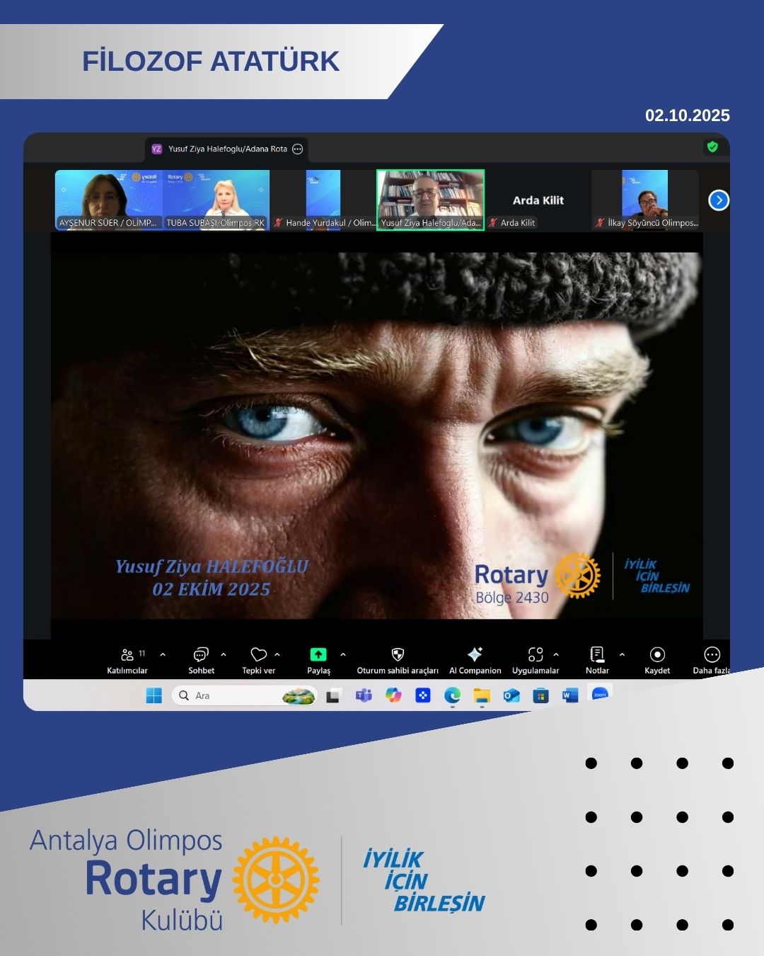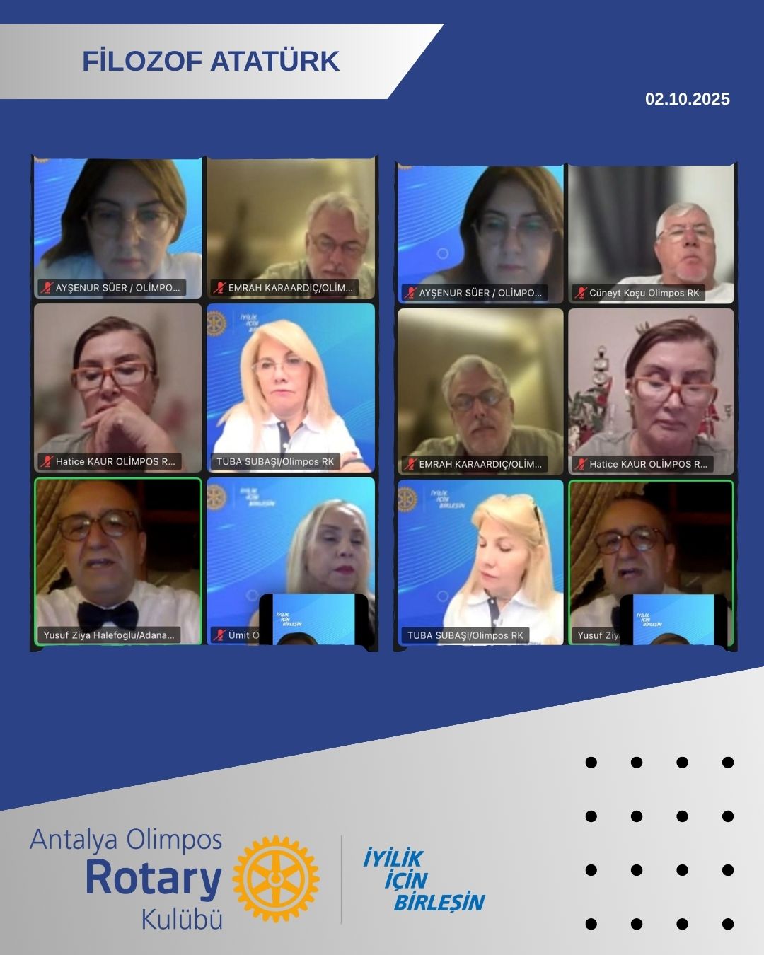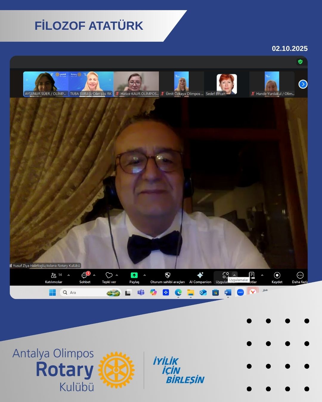 Antalya Olimpos Rotary Kulübü üyeleri, 2 Ekim 2025 tarihinde Doç. Dr. Yusuf Ziya Halefoğlu tarafından verilen ''FİLOZOF ATATÜRK'' isimli sunumda zoom toplantısında buluştular. Atatürk'ün almış olduğu eğitimler, okuduğu kitaplar ile şekillenen filozof yönü üzerinde oldukça güzel bir sunum gerçekleştiren @doc.dr.yusufziyahalefoglu 'na teşekkür ederiz.