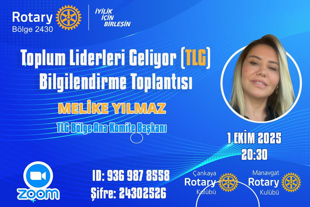 TLG Bölge Ana Komitemiz tarafından 01.EKİM.2025 tarihinde ZOOM üzerinden saat 20:30 da TLG BİLGİLENDİRME toplantısı Çankaya Rotary Kulübü ile Manavgat Rotary Kulübü ev sahipliğinde gerçekleştirilecektir.
