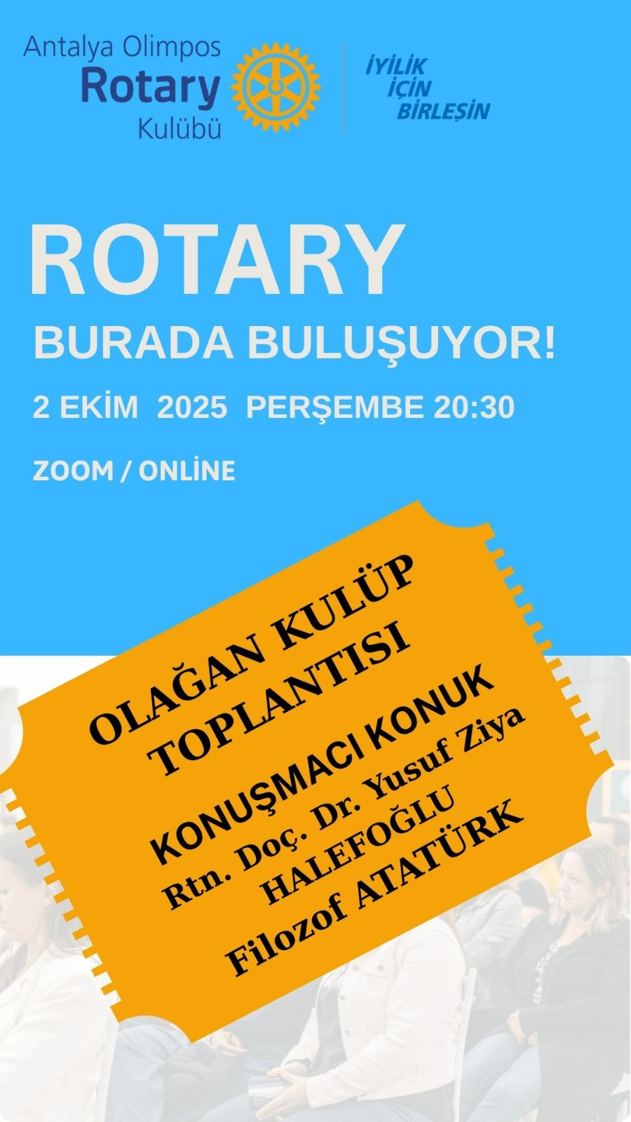 Ekim ayının ilk OLAĞAN TOPLANTISI 2 Ekim Perşembe akşamı zoom üzerinden online olarak gerçekleşecektir. Konuşmacı Bankasından konuğumuz Rtn. Doç. Dr. Yusuf Ziya HALEFOĞLU '' FİLOZOF ATATÜRK '' sunumu ile toplantımıza katılacaktır. Ulu önder ATATÜRK ile ilgili bu harika sunumda tüm kulüp üyelerimiz ile birlikte olmayı arzu ediyoruz.