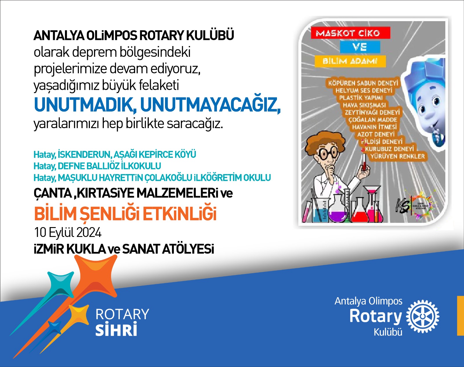 Olimpos Rotary Kulübü, 10 Eylül 2024 tarihinde Hatay İskenderun Aşağı Kepirce Köyü İlköğretim Okulu, Hatay-Defne Ballıöz İlkokulu ve Hatay Maşuklu Hayrettin Çolakoğlu İlköğretim Okulu öğrencilerine “Çantanız ve Kırtasiyeniz Bizden Projesi” kapsamında “Bilim Şenliği” düzenledi.