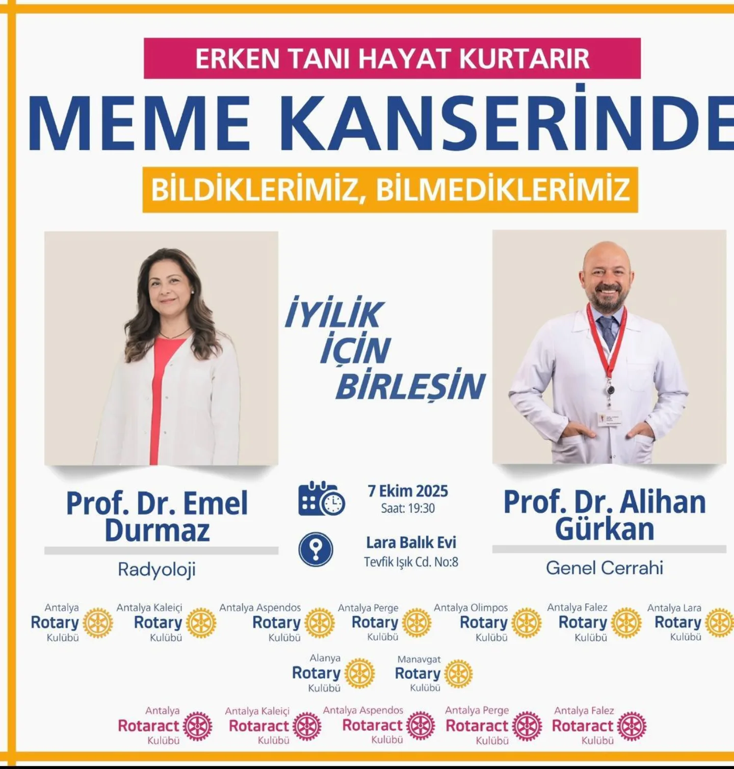7 EKİM 2025 TE ANTALYA ROTARY VE ROTARACT KULÜPLERİ İLE İNTERCİTY TOPLANTISI GERÇEKLEŞTİRİLDİ. PROF. DR. EMEL DURMAZ VE PROF. DR. ALİHAN GÜRKAN ‘MEME KANSERİNDE BİLDİKLERİMİZ VE BİLMEDİKLERİMİZ ‘ KONULU SÖYLEŞİ GERÇEKLEŞTİRDİLER