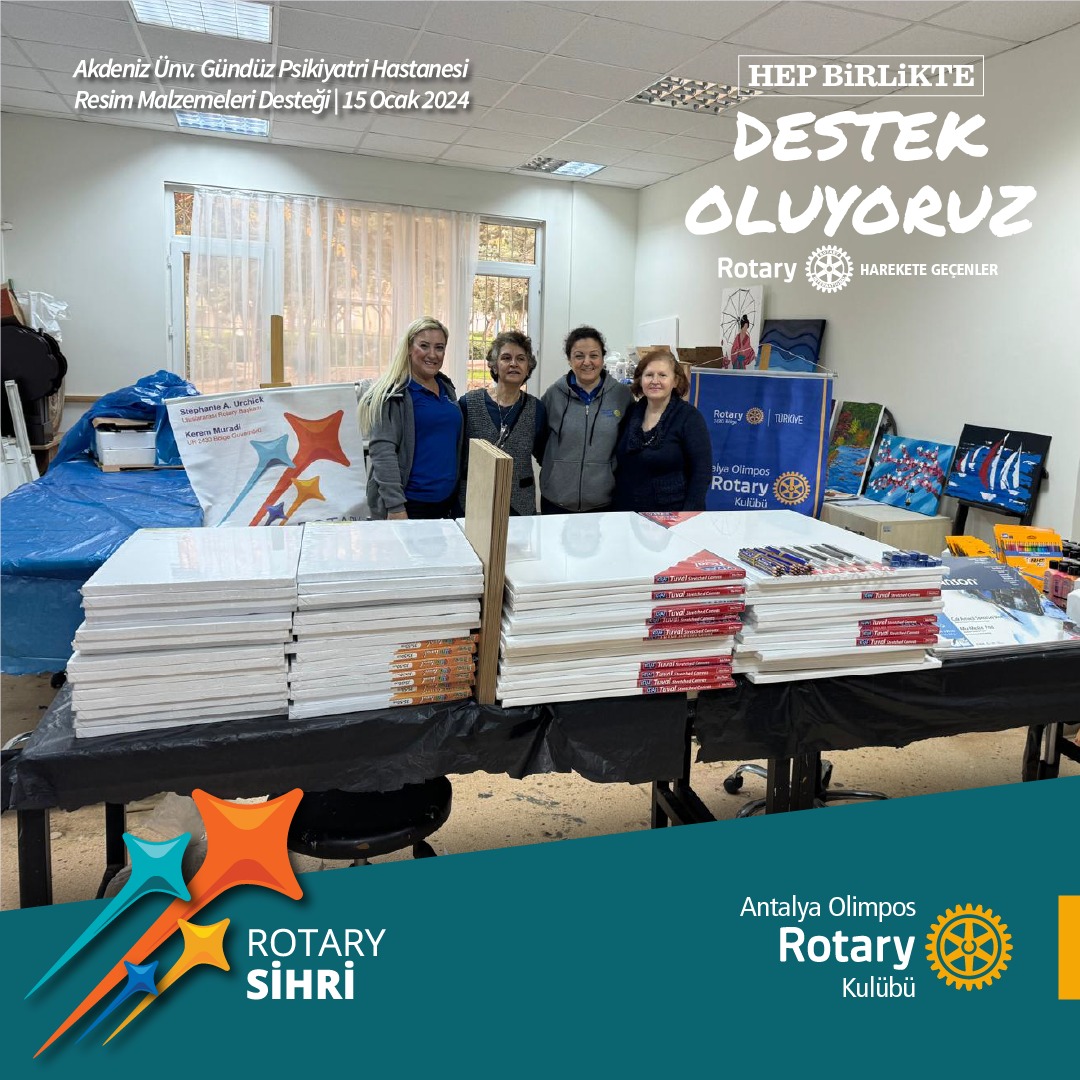 "Akdeniz Üniversitesi Psikiyatri Gündüz Hastanesi"ne Ekim ayında ziyarete gitmiştik. Ziyaretimiz sonucunda bu dönem içinde ortak bir proje yapmayı planlamıştık . Sonrasında yaptığımız görüşmelerde , Şubat ayı sonunda Antalya Müzesinde yapacakları resim sergisi için malzeme desteğinde bulunma sözü vermiştik. Bugün malzemeler teslim edildi. Hastaların malzemeleri görünce, hepsi bizim mi diyerek gösterdikleri tepki, sevinçleri ve şaşkın ifadeleri, bir kere daha "İyi ki Rotaryenim" dedirtti. Olimpos Rotary Ailesine teşekkür ve selamlarını ilettiler . Bir Sihir daha gerçekleşti. İyi ki varsınız @antalyaolimposrotary