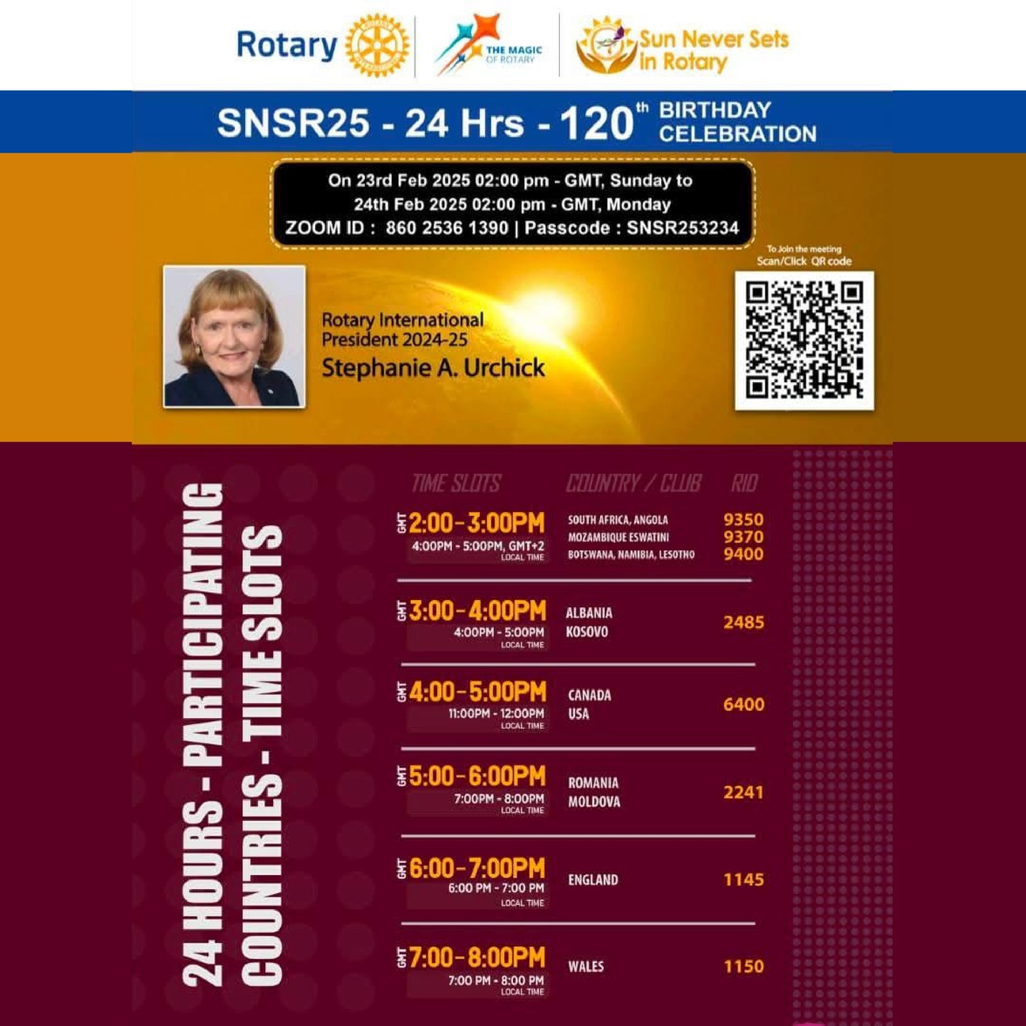 Uluslararası Rotary 120. Yılını “Rotary’de Güneş Asla Batmaz” diyerek yirmi dört saatlik bir etkinlikle kutluyor. Bu soğuk kış gününde dünyanın dört bir yanındaki ülkelere, bölgelere konuk olabilirsiniz. (Rotary Türkiye İstanbul’daki Barış Konferansı’na ev sahipliği yaptığı için bu yıl bu etkinlikte yer almadı ama teknik desteği ile etkinliğin içinde yer alıyor) Zoom bilgileri: Zoom ID: 860 2536 1390 Şifre: SNSR253234 *Etkinlik 23 Şubat Türkiye saati ile 17.00’de başlayıp 24 saat kesintisiz sürecektir. RSS